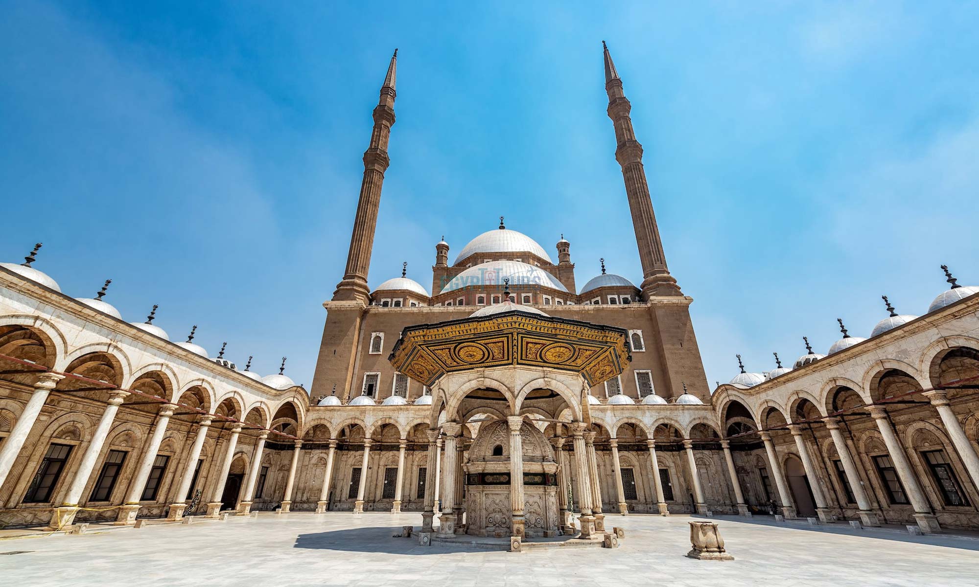 Although inspired by the Sultan Ahmed Mosque in Istanbul, the Muhammad Ali Mosque is smaller but stands out due to its elevated position and strong visual impact on Cairo.